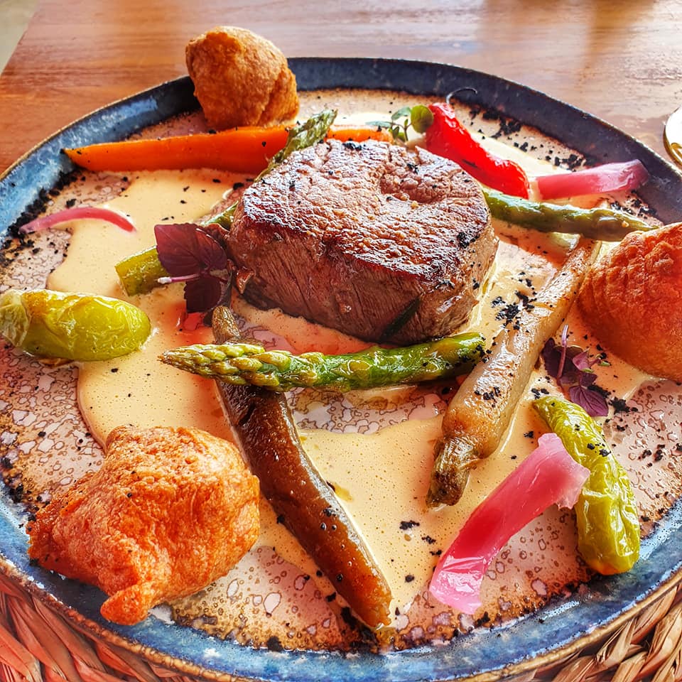 Dans nos assiettes, filet de bœuf et sa sauce béarnaise légère, pommes dauphines et légumes rôtis.